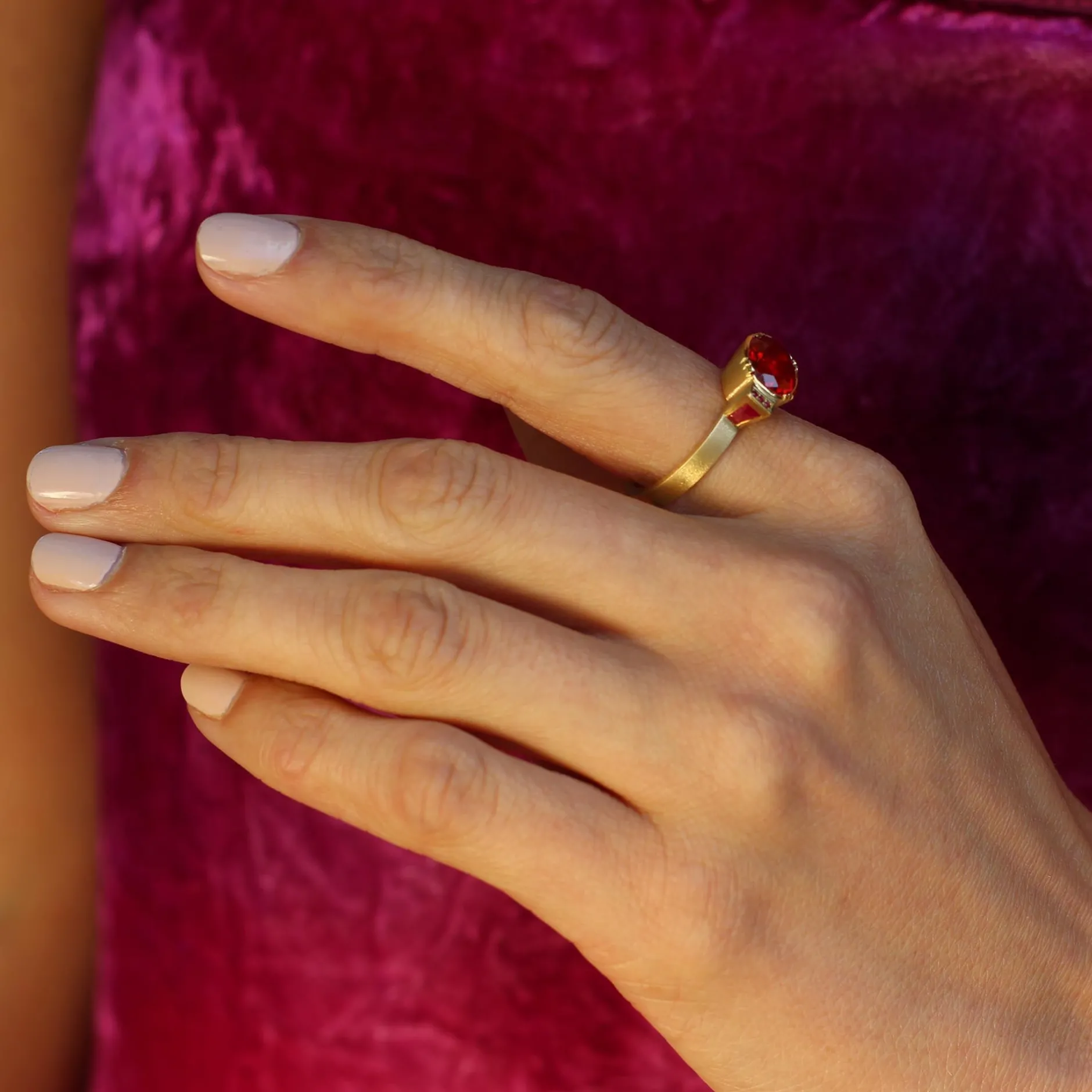 18k gold georgian bezel fire opal ring with ruby pave detail.