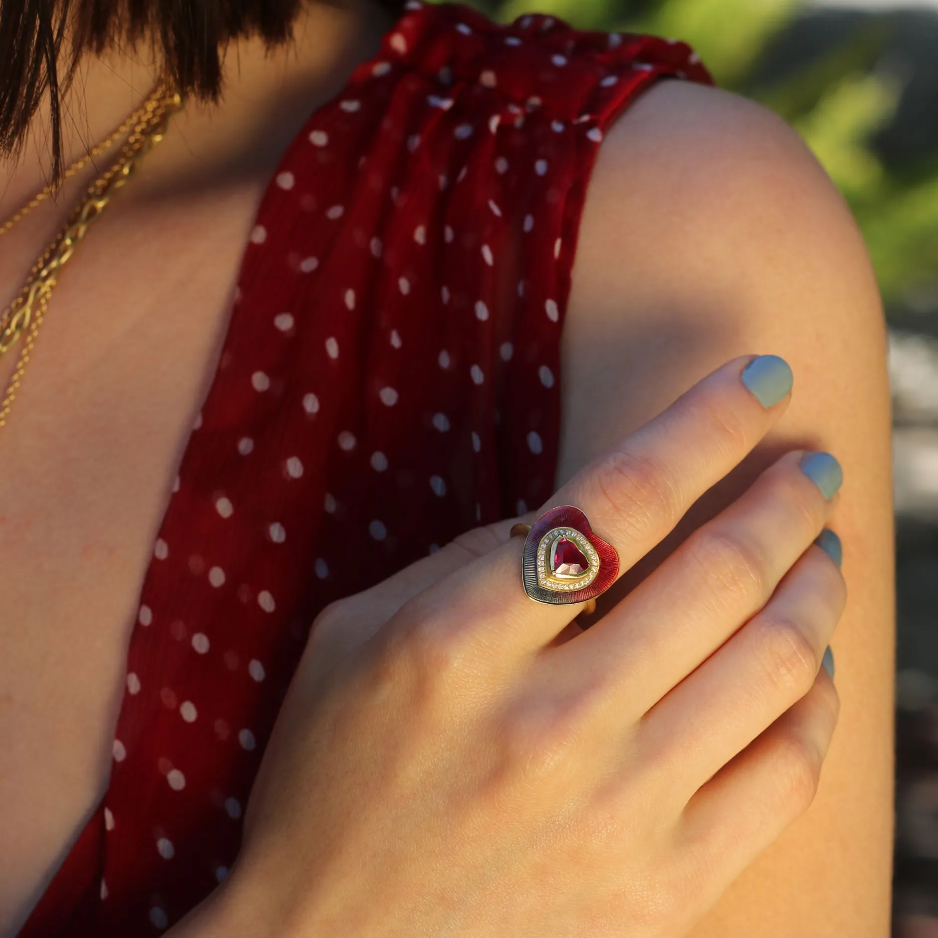 18k gold georgian bezel ruby ring with hand engraving and enamel and diamond pave detail.