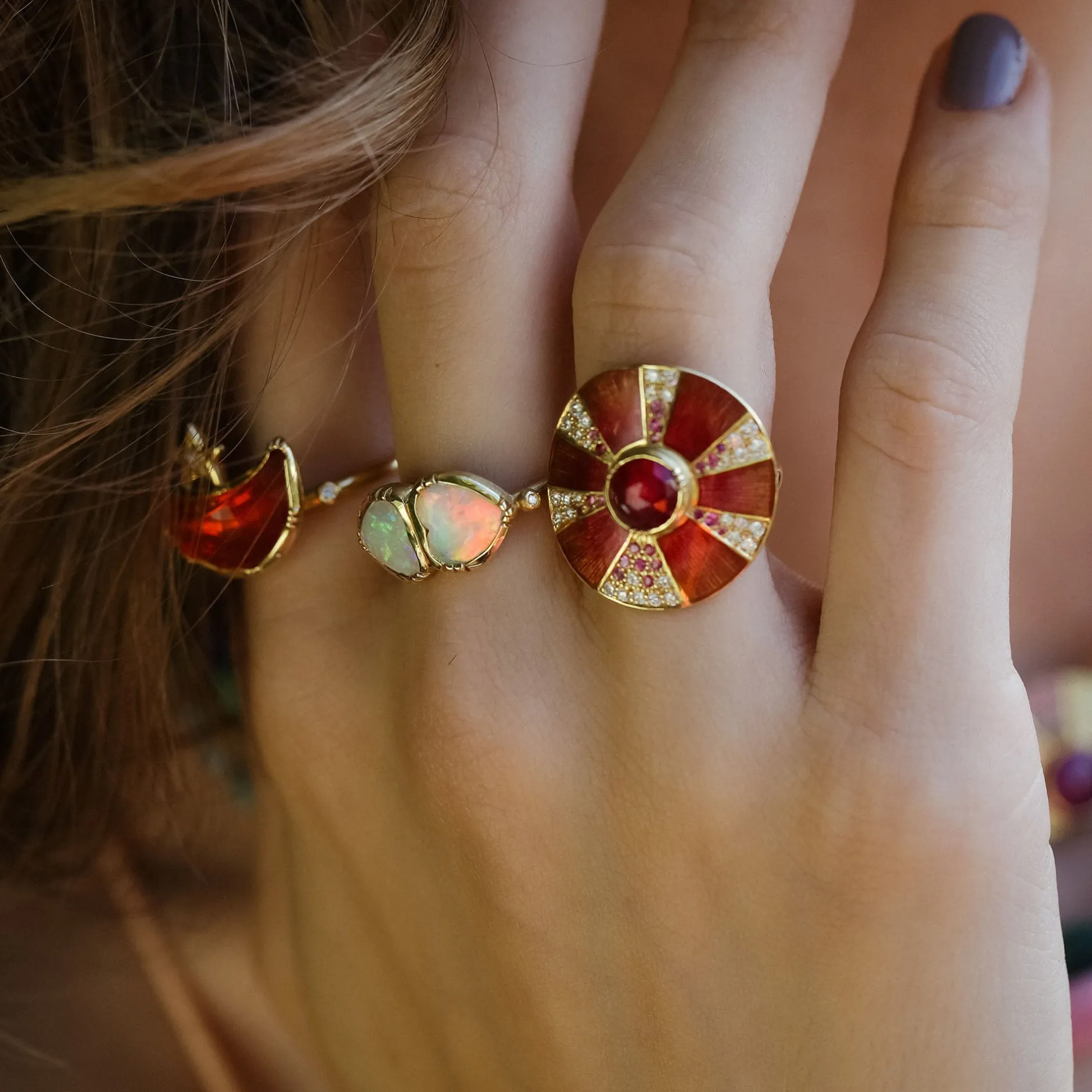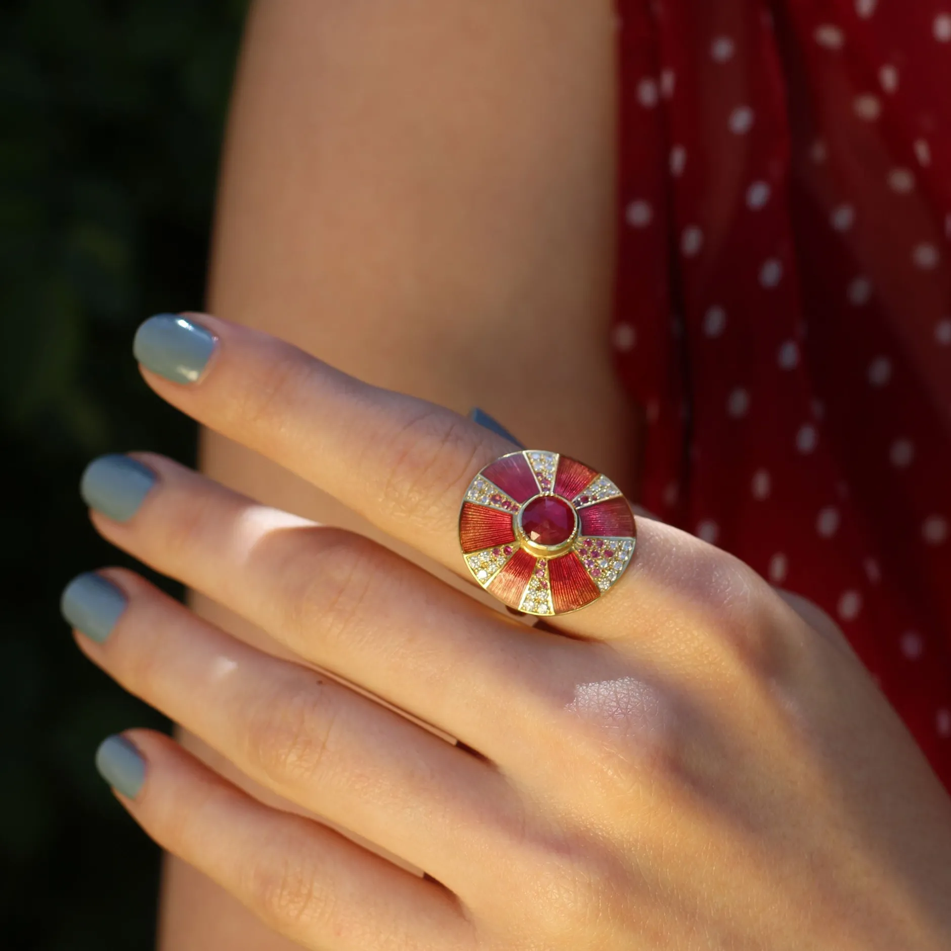 18k gold georgian bezel ruby ring with diamond and pink sapphire pave and hand engraving and enamel detail.