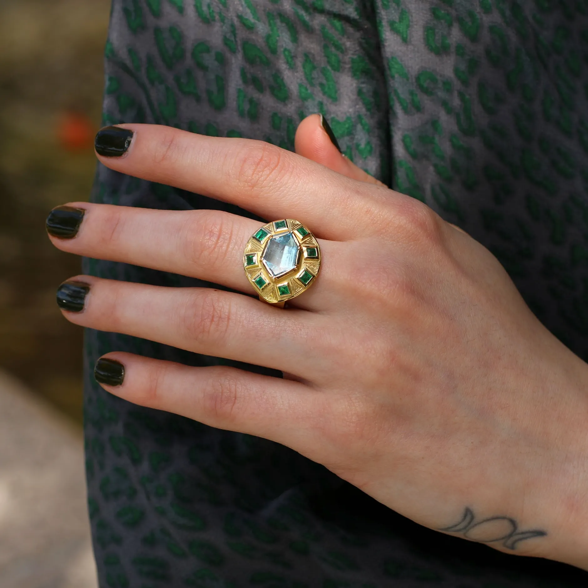 18k gold georgian bezel aquamarine and emerald ring with hand engraved detail.