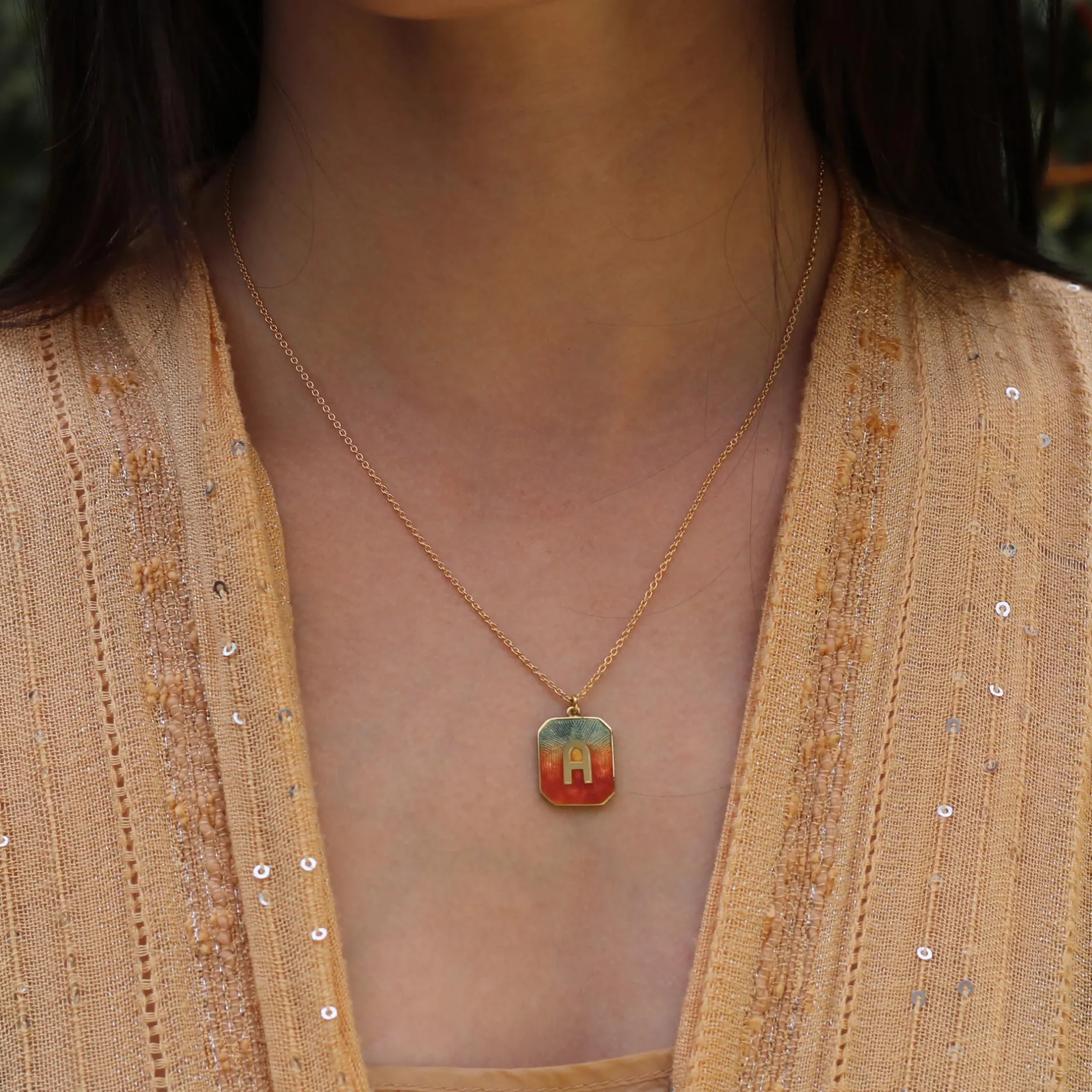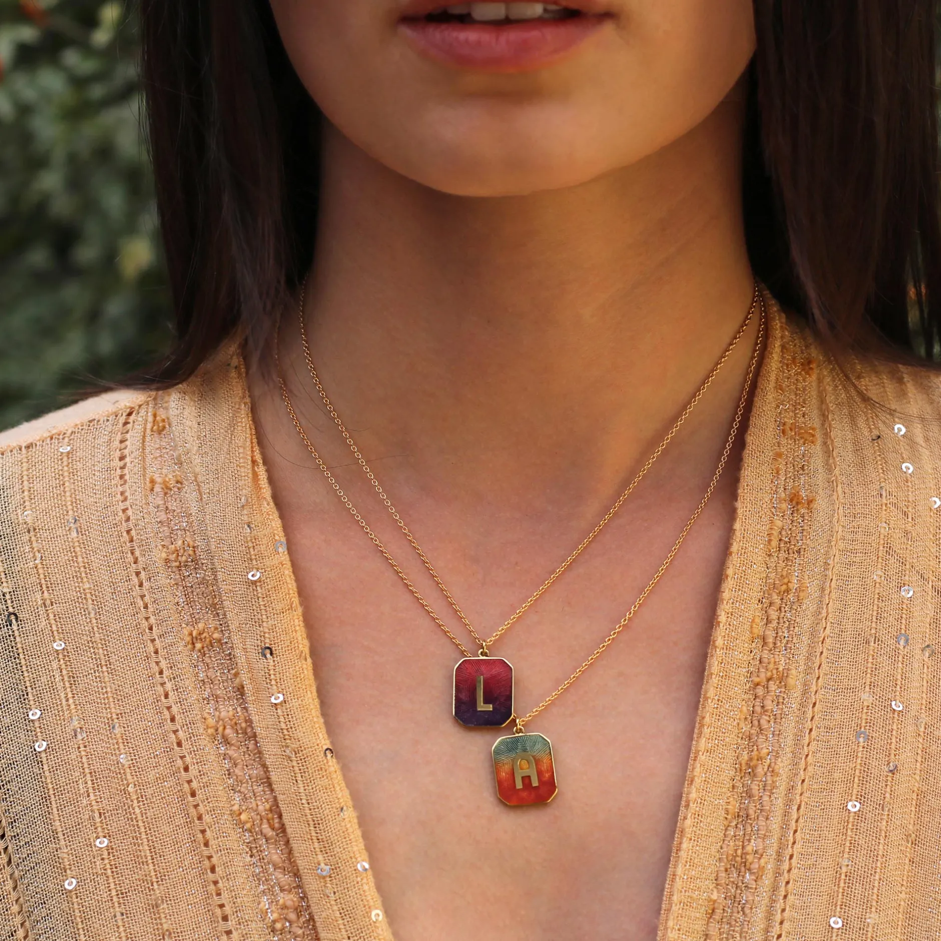 18-karat yellow gold alphabet necklace with hand engraving and enamel detail. Our 18-karat gold jewelry is hand forged by expert metalsmiths using recycled gold, reflecting our love and respect for the process of quality craftsmanship and sustainability. We use a hot enamel process that uses glass, fired in a kiln, to create beautiful depth of color with a translucent finish. Colors will vary slightly as each necklace is hand made.