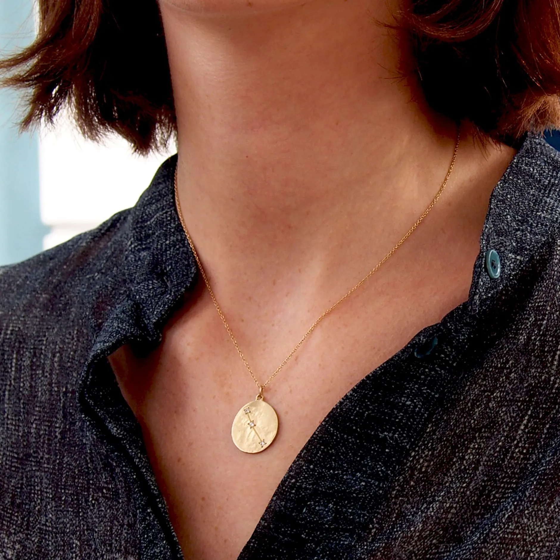 14-karat brushed gold Astrology necklace with 3 EF color VS1 clarity full cut diamonds in an Aries constellation design and 14-karat gold chain. Brooke’s inspiration was the texture of the moon making it the perfect canvas for starry constellations.