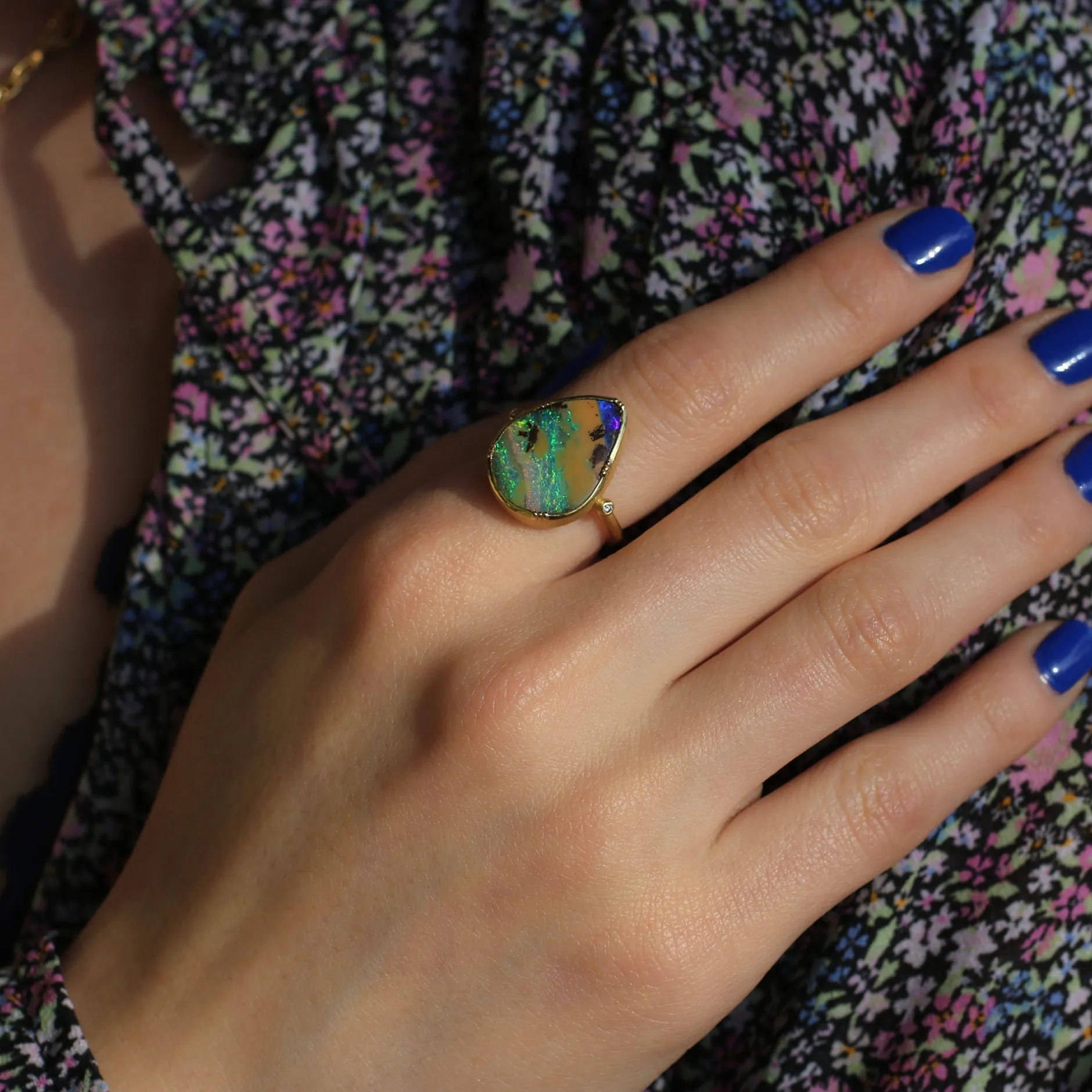 One of a kind, 18-karat yellow gold Georgian bezel set boulder opal ring with diamond beaded shoulders. Our 18-karat gold jewelry is hand forged by expert metalsmiths using recycled gold, reflecting our love and respect for the process of quality craftsmanship and sustainability.