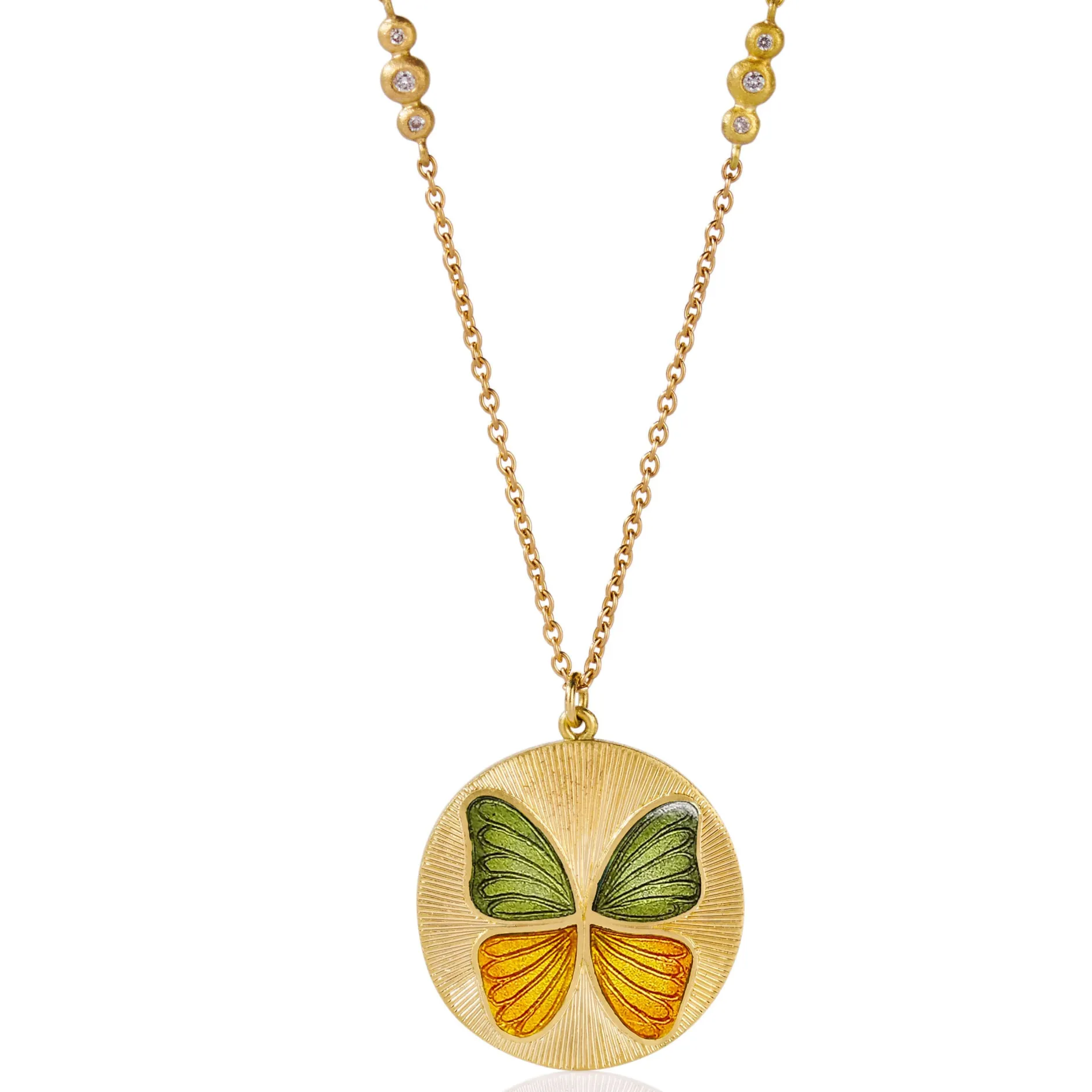 18-karat yellow gold butterfly enamel necklace with hand engraving and beaded diamond detail on chain. Our 18-karat gold jewelry is hand forged by expert metalsmiths using recycled gold, reflecting our love and respect for the process of quality craftsmanship and sustainability. We use a hot enamel process that uses glass, fired in a kiln, to create beautiful depth of color with a translucent finish. Colors will vary slightly as each necklace is hand made.
