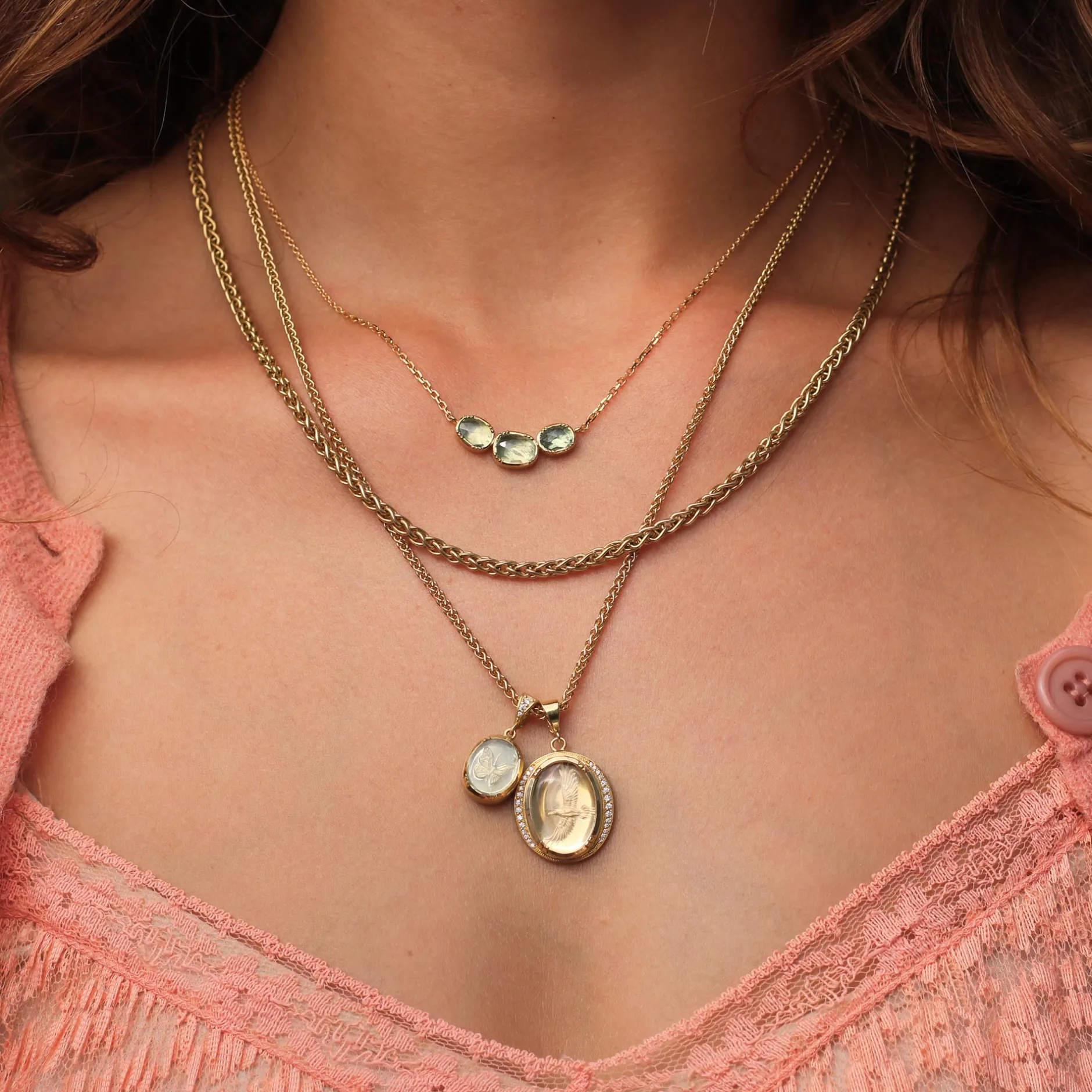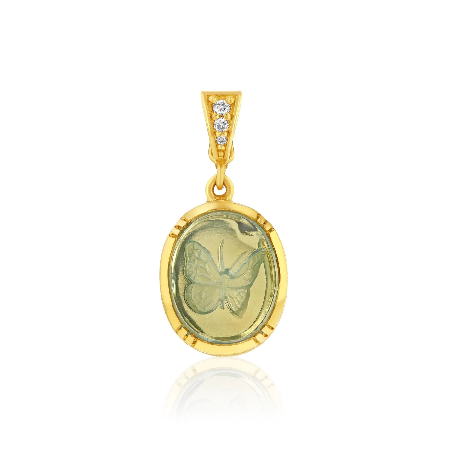 One of a kind, 18-karat yellow gold Georgian bezel set hand carved blue topaz butterfly charm with diamond enhancer. Our 18-karat gold jewelry is hand forged by expert metalsmiths using recycled gold, reflecting our love and respect for the process of quality craftsmanship and sustainability.