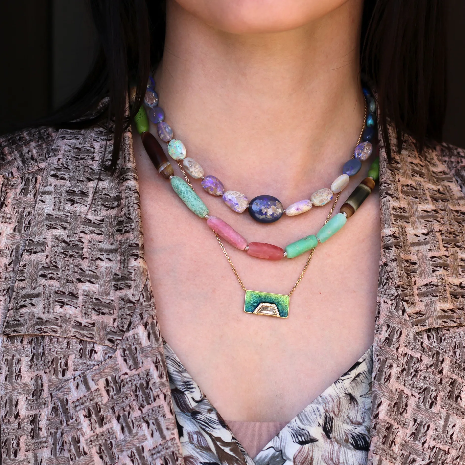 This hand engraved necklace is inspired by Brooke’s creative ink drawings. In collaboration with master engravers and enamellers and brought to life in gold form.