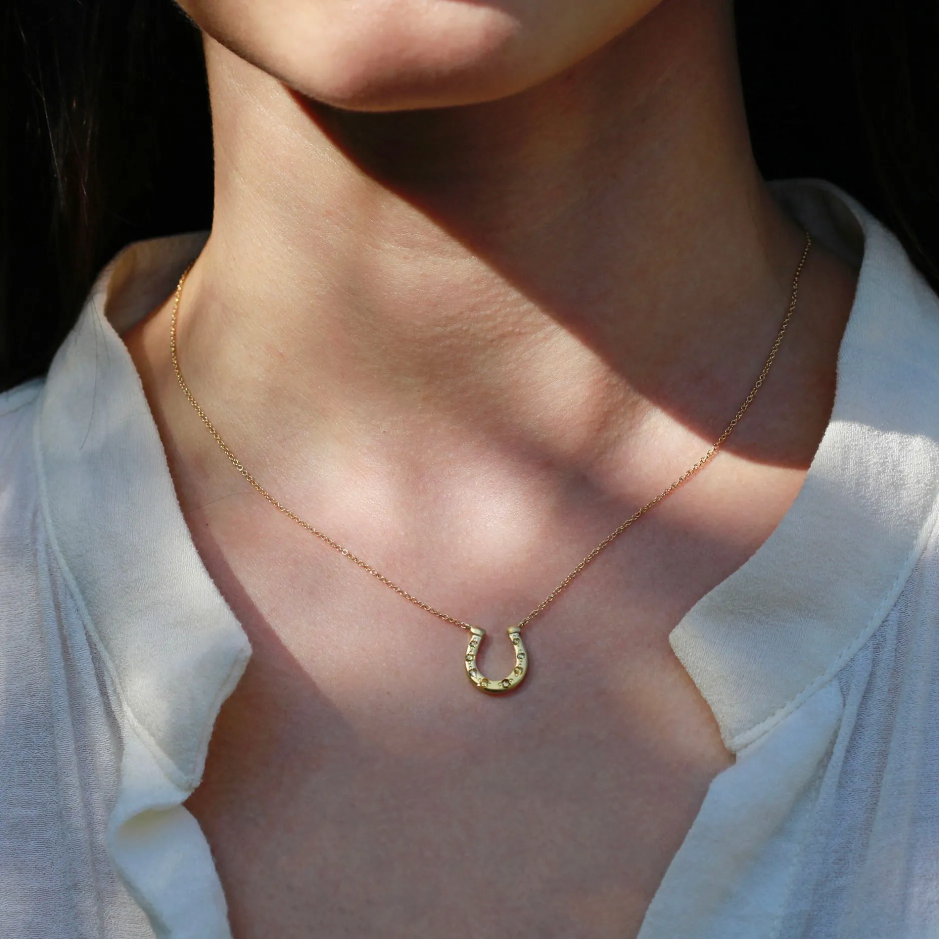 18k gold horseshoe necklace with mixed rose cut diamond and 18k gold chain.