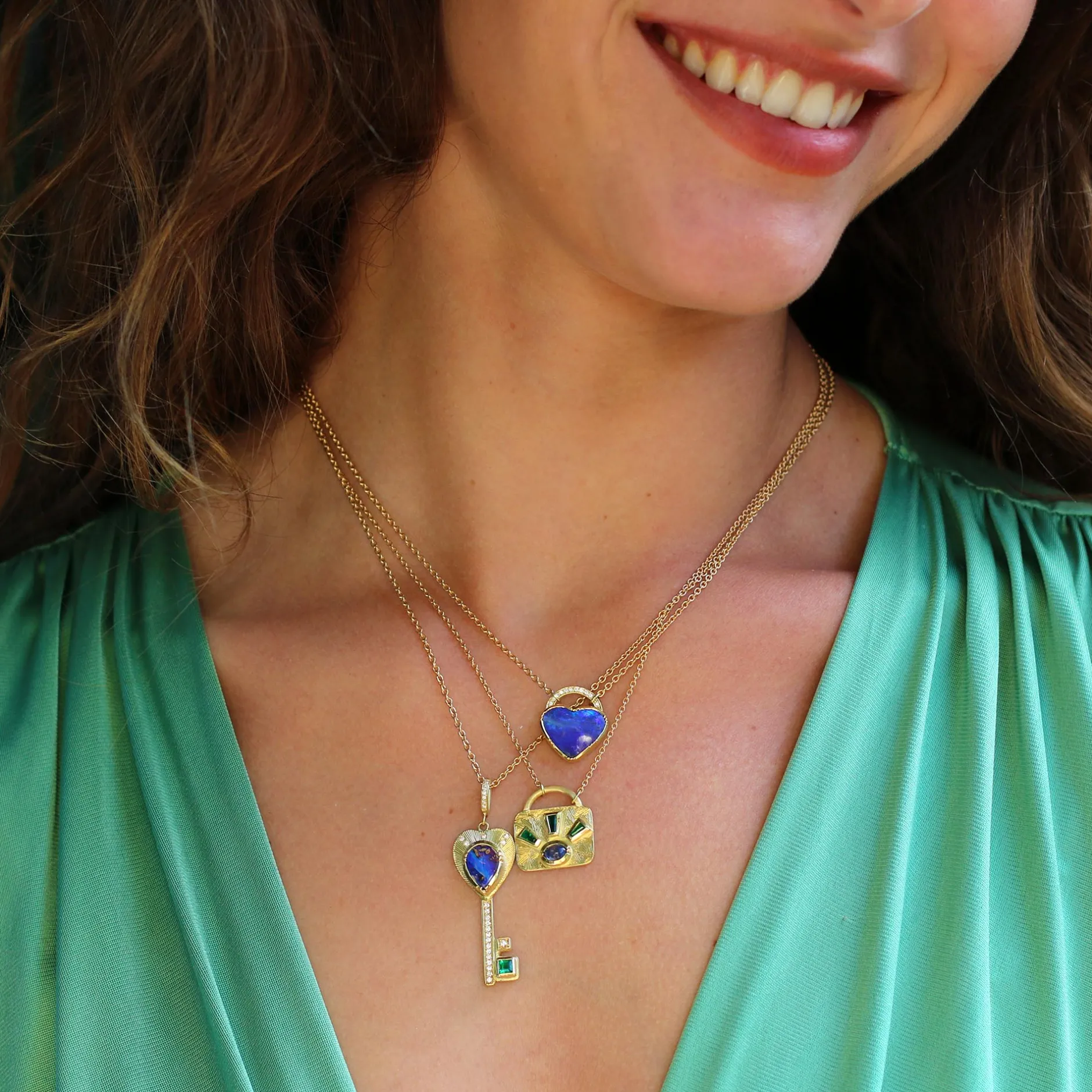 18k gold georgian bezel emerald and sapphire lock necklace with hand engraved detail.