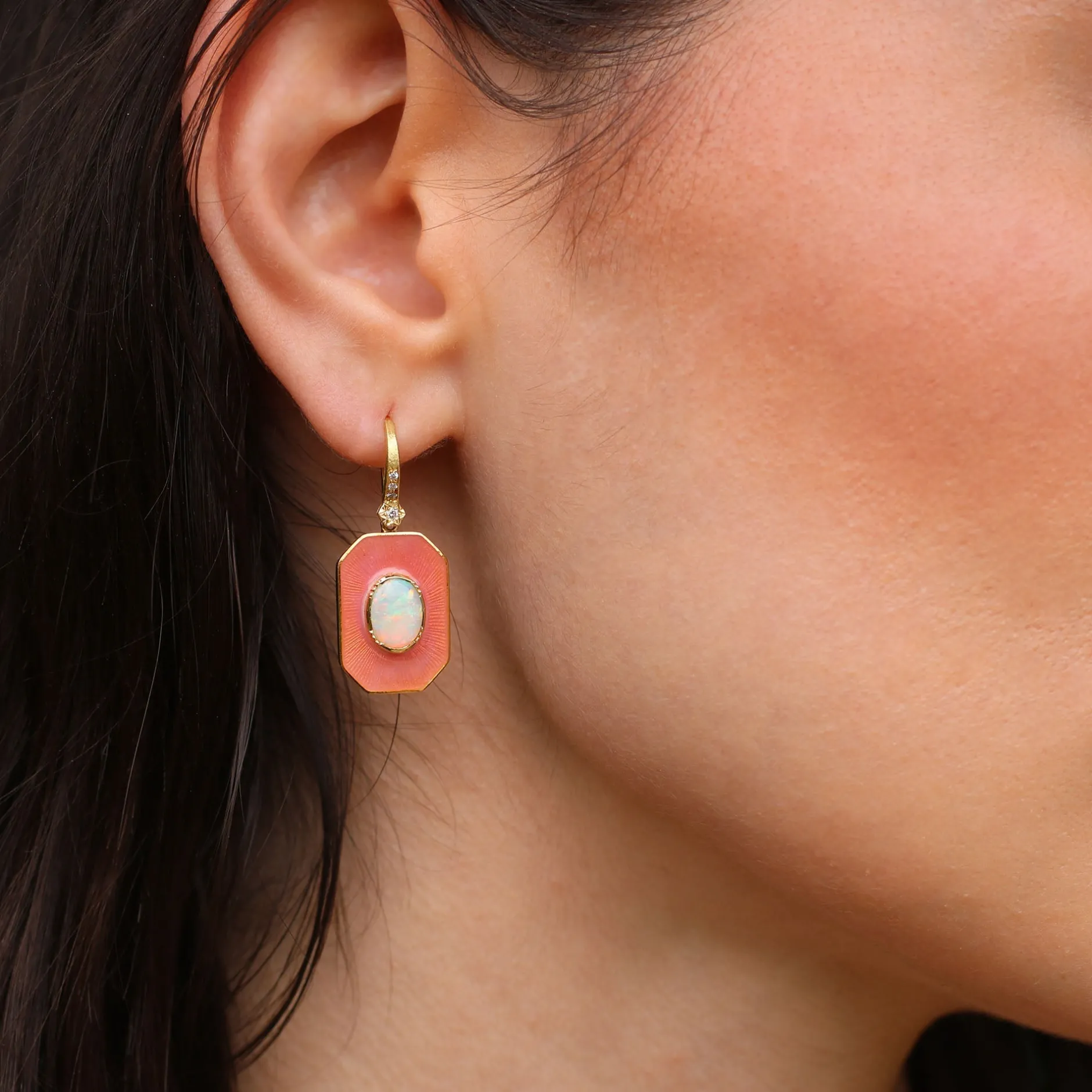 18k gold georgian style bezel opal earrings with hand engraved and enamel detail with diamond ear loop.