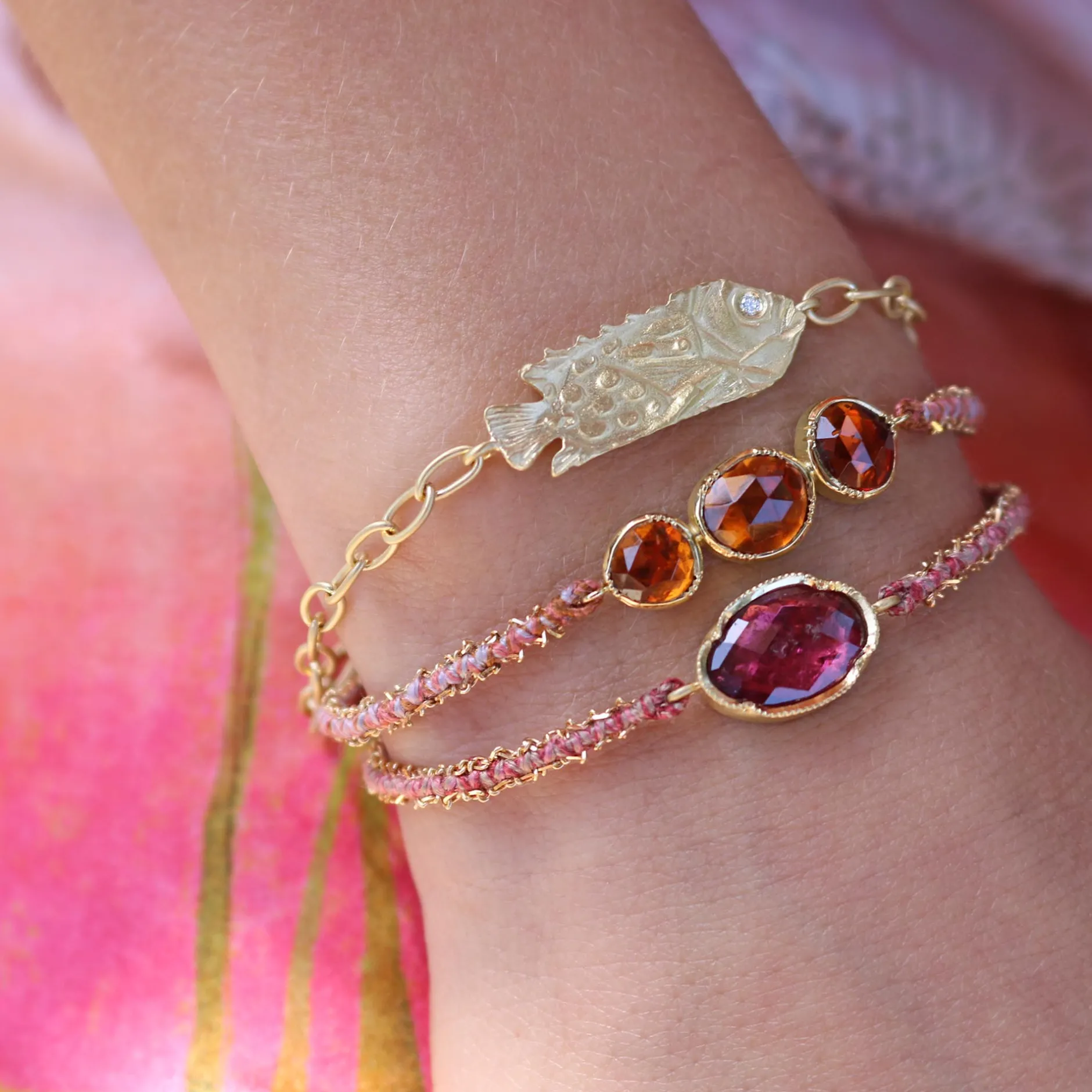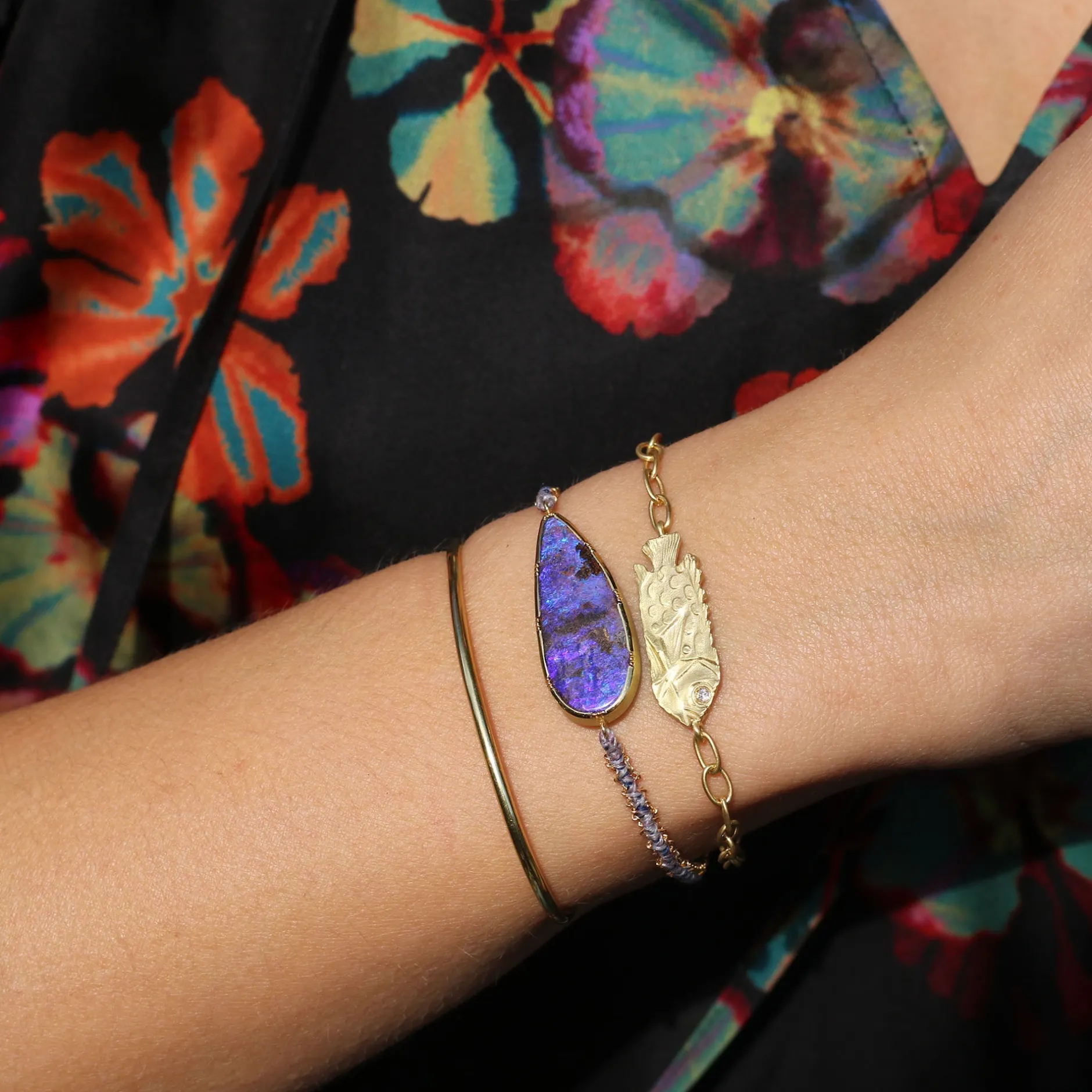 18k gold carved fish bracelet with diamond pave eye and hand forged chain bracelet