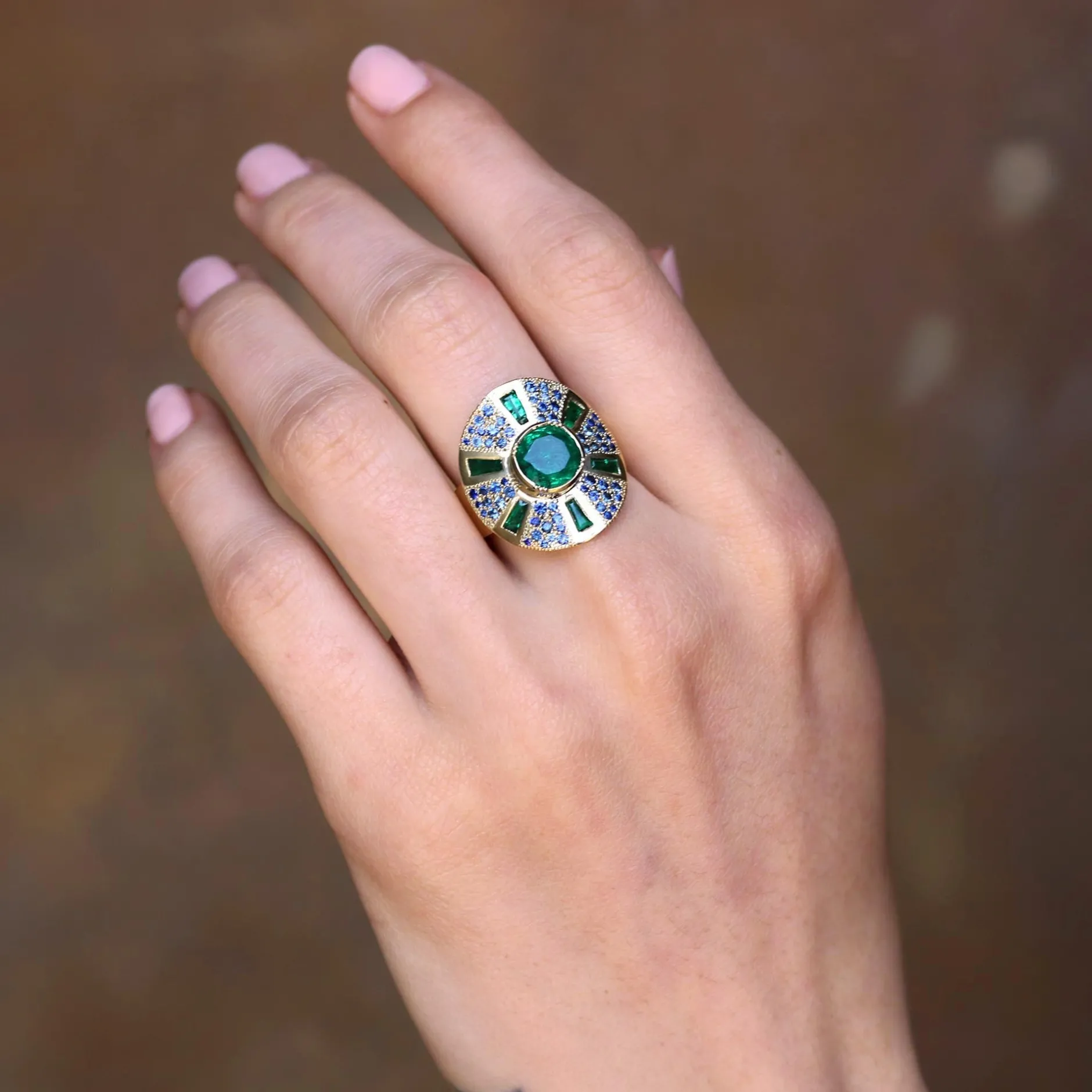 18k gold georgian bezel cabuchon and baguette emerald ring with blue sapphire pave detail.