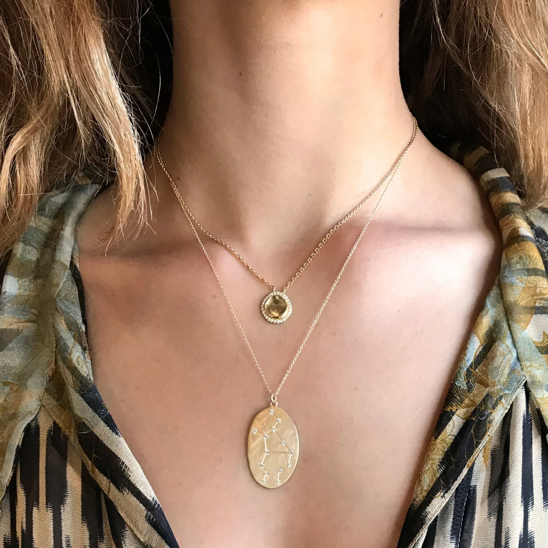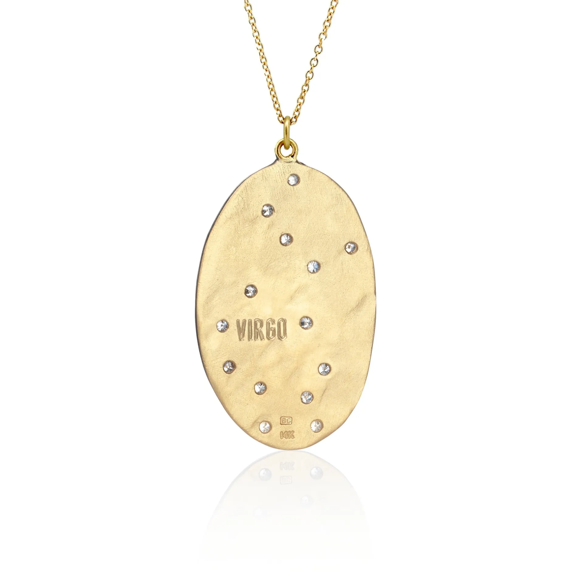 14k brushed gold Astrology necklace with 14 VS1 full cut diamonds in a constellation design with 14k gold chain.